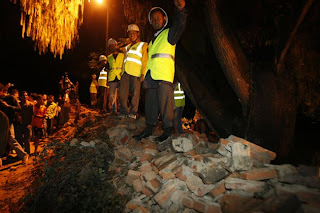In this photo taken with a mobile phone, the debris of a residential building is seen after a 6.9 magnitude earthquake, in Lumsey, located near the northeastern Indian city of Gangtok September 19, 2011. Soldiers and rescue workers hiked through lashing rain to isolated Himalayan villages on Monday to search for survivors of a 6.9 magnitude earthquake that killed at least 53 people in India, Nepal and China. REUTERS/Stringer (INDIA - Tags: